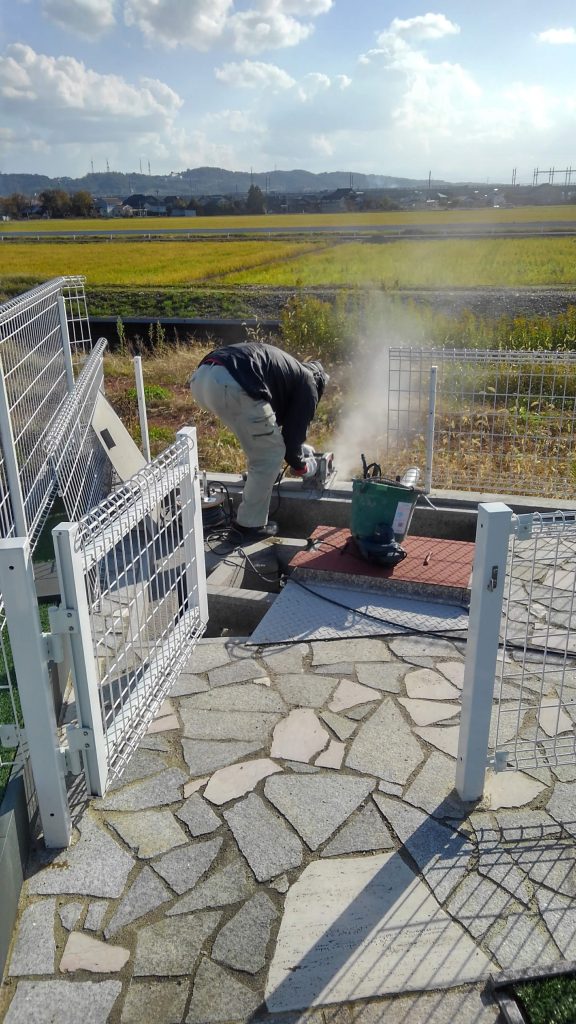 2019.11.12 その他 呉立苑にて お昼過ぎ、呉立苑に立ち寄ると作業中の水野氏が。。 集水桝のオーバーフローの配管の補修の様で、コンクリにカッターを入れておりました。 管理運運営を受託しておりますので霊苑内の修繕に日々努めております。
